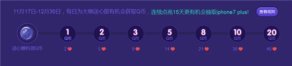 11月17日-12月30日,每日为大咖送心即有机会获取Q币,连续点亮15天更有机会抽取iphone7 plus!
