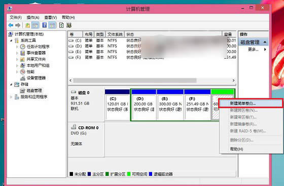 三、这个时候,这个新分区还不可用,这里我们还需要新建简单分卷。操作方法是,在这个新分区上右键,然后选择“新建简单卷”,如下图所示: