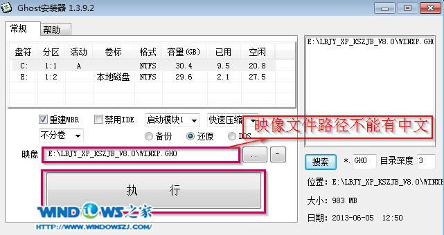 4.在出现的Ghost安装器界面中,选择映像文件的路径,并点击“执行”,如图4所示: