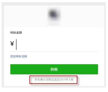 6.给任意好友转账任意金额将显示,【好友确认收款后延迟24小时/2小时入账】;