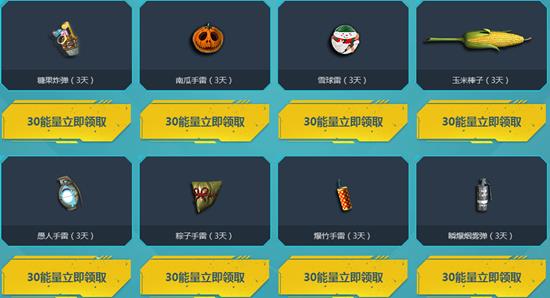 糖果炸弹(3天)、南瓜手雷(3天)、雪球雷(3天)、玉米棒子(3天)、愚人手雷(3天)、粽子手雷(3天)、爆竹手雷(3天)、瞬爆烟雾弹(3天)