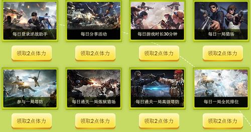 每日登录逆战助手、每日分享活动、每日游戏时长30分钟、每日一局猎场、参与一局塔防、每日通过一局炼狱猎场、每日通关一局高级塔防、每日一局全民排位
