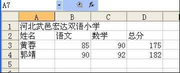 如图2-2-6所示,A1单元格中的“河北省武邑县宏达双语小学”这几个字在A1格中是容纳不下的,它已经挤到C1格中去了,此时我们需要调整一下A列的列宽。