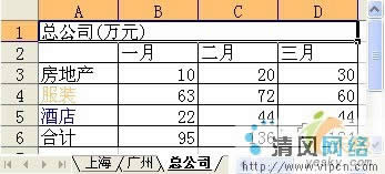 某企业有两个销售分公司,当总公司希望得到各产品销量总额时,可以使用“合并计算”功能来汇总数据。下面以大发公司第一季度每月的销售情况为例进行介绍,在本例中将对上海、广州两个分公司的工作表进行汇总,其结果保存在总公司的工作表中。