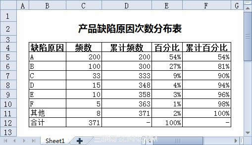 假设我们已经在wps表格中制作出一个如下的产品缺陷原因次数分布表。