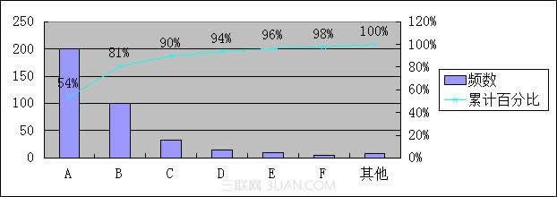 帕累托图中包含一个柱形图和一个折线图,有左右两个纵坐标,及一个横坐标。左边纵轴表示缺陷原因的频数,右边纵轴表示缺陷原因的累计频率,横轴表示影响质量的各项因素,按其影响大小,从左至右依次排列。直方柱高度表示因素影响大小,折线表示各项累计频率的连线。