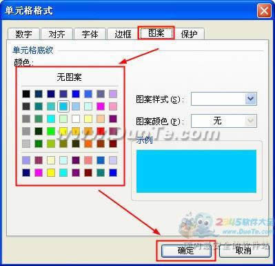 打开单元格格式窗口后,在“图案”选项卡中可以选择底纹的颜色,挑选完成后点击“确定”按钮。