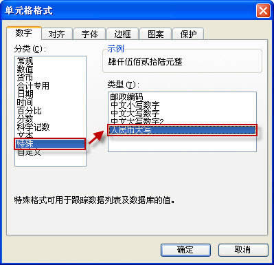 5、用上述方法合并B29:F29单元格区域并输入公式“=SUM(F4:F27)”;按会计工作要求,“共计款”应当按大写形式呈现,所以需要在合并后的单元格上单击鼠标右键,在弹出的下拉菜单里单击“设置单元格格式”命令,在弹出的“单元格格式”对话框里,单击“分类”标签下的“特殊”选项,在右侧的“类型”标签下单击“人民币大写”选项(如图 10)后,单击“确定”按钮关闭对话框,单元格里的数据就会自动变成大写形式(如图11)。