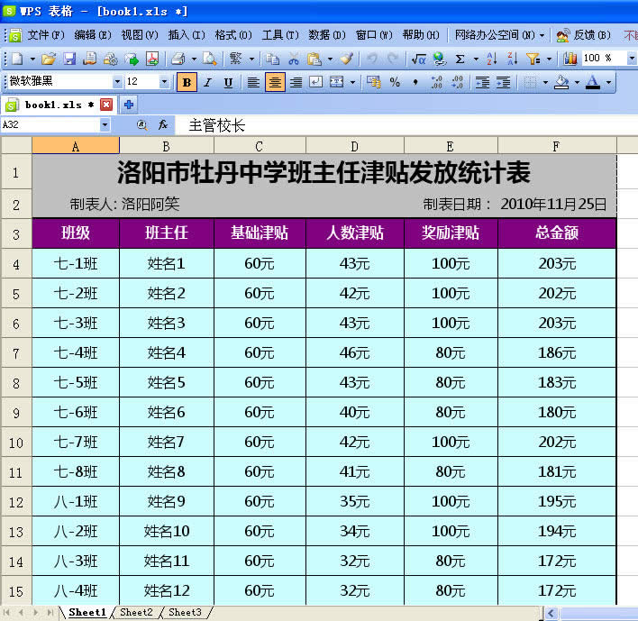 每个月初,政教处都要结合各班级的考核成绩制作《班主任津贴发放统计表》(笔者注:我校班主任月津贴由三部分组成:基础津贴60元,人数津贴每生1元,奖励津贴分为两等,先进班集体100元,普通班集体80元。),为了提高工作效率,笔者用WPS表格制作了一份模板(如图1),只需双击该模板运行WPS表格,在新建的表格中修改部分数据,相关的运算结果就会自动生成,非常方便快捷。