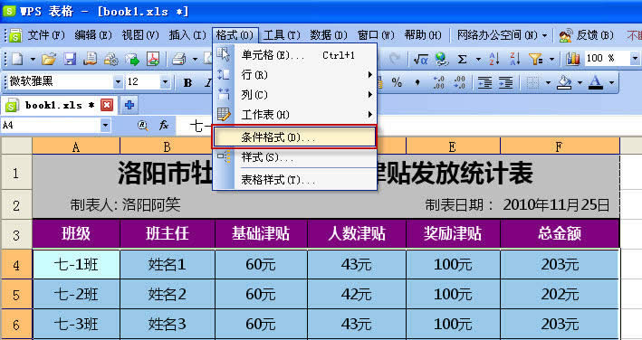 拖动鼠标选中存放津贴信息的A4:F27单元格区域后,单击“格式”菜单下的“条件格式”命令(如图15),在弹出的“条件格式”对话框里,单击“单元格数值”右侧的下拉箭头,在弹出的下拉列表里单击 “公式”选项(如图16),在右侧的文本框里输入公式“=($E4=100)”后,单击“格式”按钮(如图17),在弹出的“单元格格式”对话框里,单击顶部的“字体”标签,将字形设为“粗体”(如图18);再单击对话框顶部的“图案”标签,将单元格底纹颜色设置为较浅的蓝色(如图19),依次单击“确定”按钮关闭对话框。