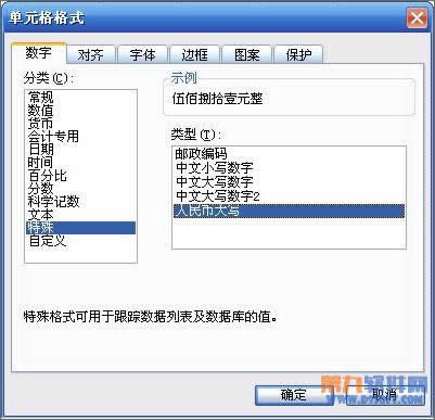 首先,光标定位在要设置为大写中文货币的单元格上;然后,点击‘格式’菜单中的‘单元格’,弹出‘单元格格式’对话框,在‘数字’选项卡的‘分类’栏中选择‘特殊’,然后在右边的‘类型’栏中选择‘人民币大写’(如图2)
