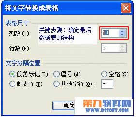 步骤7 完成数据转换:保持选定的状态下,最后选择“表格|转换|文本转换成表格”菜单项,在弹出的对话框中设置转换列数为:10列(此数值根据用户实际的字段数而定),文字分隔位置选择“段落标记”选项,点击“确定”按钮。