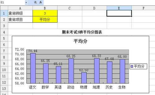 最后,我们只需要在B1、B2单元格中选择好要查询的班级和查询的项目,那么就会实时地在下方出现相关的数据图表,用WPS的表格工具,一份学生成绩分析表就完成了。