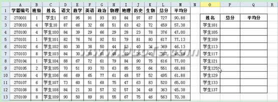 选中O3:P3单元格,拖动其填充句柄向下复制公式,表格中所有学生的总分和平均分就都查到了。