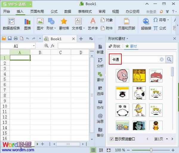 ①启动WPS表格2013,单击菜单栏--插入--素材库。