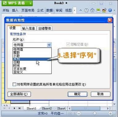 接下来我们对数据的有效性条件进行设置,在对话框中选择“设置”的选项卡,在选项卡中的打开“允许”下方的下拉式菜单,选择序列。如图3