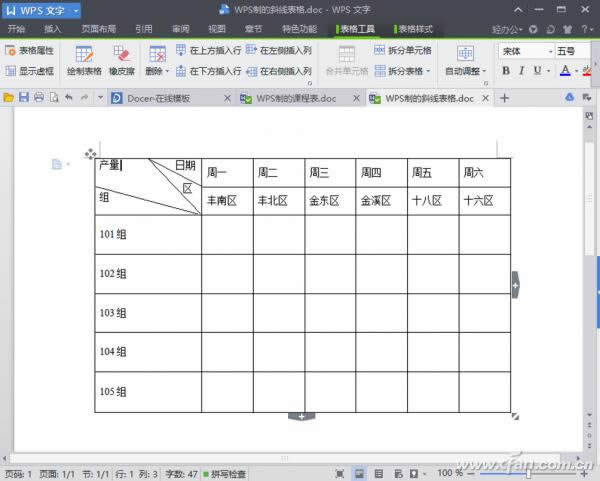 用最新版的WPS先拖动插入一个6行7列的规整表格,切换到“表格工具”菜单,点击“绘制表格”按钮,从第一行第二列中间开始绘制一条上下分割该行的表线,填好表头文字。接下来在左上角单元格中用“绘制表格”工具直接画出三条斜线,然后填入表头文字即可。