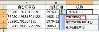 这样,C列的数据就由文本格式转换成了真正的“日期”格式,但是,细心的你应该已经发现了,只有正确的日期才能成功转换,其对齐方式自动变成了“右对齐”,而错误的日期则没有转换,仍是文本格式,对齐方式仍为“左对齐”,把C列的列宽适应加大,就“正确的向右,错误的靠左”了!你需要做的,就是校对错误的身份证号,并更正它们。