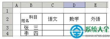 第4步、将文字(科目姓名)录入到要制作斜线表头的单元格中,并适当缩小文字的字号,其中斜线右边的文字在前,如图1。