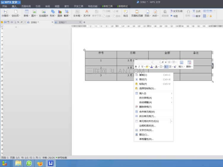 1、先把鼠标移至表格上,单击鼠标右键后,弹出下图所示的窗口。