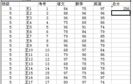 随便录入了些人和分数,然后就是求总分了,总分需要用到求和,以前需要录入复杂函数,现在只需点击开始,在右边点击求和,选择求和,就会出现下图中的函数,(注:在点求和之前,鼠标点击方格出现的黑框位置将会是结果出现的地方),用蓝框框选需要求和的项,然后回车,求和结果就出来了,需要求下面全部,同步骤3,直接下拉, “不用”ctrl结果如图