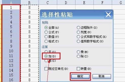 4、在A列单击鼠标的右键,在弹出的对话框中单击“选择性粘贴”,在弹出的对话框中选择“运算”中的你所需要的运算符,在此我们选择“加”,这是本方法的关键所在。