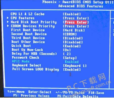 2.我们首先需要在开机的时候进入到bios设置中,大家可以根据自己的电脑型号搜索进入方式,一般按下del键即可,我们在里面选择advanced bios features。