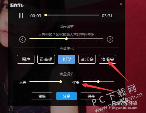4.然后就是用户自己演唱的时间啦,演唱完成之后我们还能够在里面调节不同的效果等等,之后点击下面的保存。