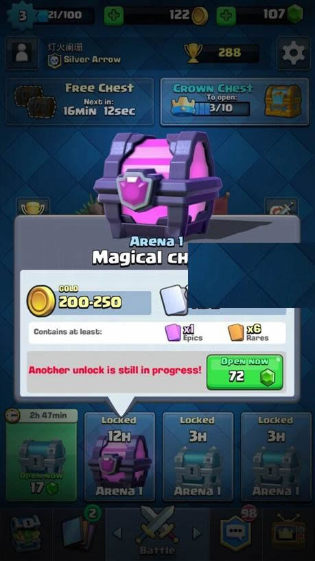 提醒:关于紫箱的话,一般在2-3本,1-2级竞技场就可以开1-2个!排在12位,第二个紫箱在132位,前面要开120个箱子,大约是25天后拿到(有参考其他玩家数据,大家可以作为参考,误差其实不是很大,只是要每天计算下获得的箱子数)