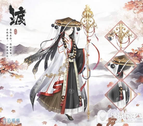 【渡】为云端僧侣的服装,含特色部件“头饰·檀思”、“手持·因果”,及特殊姿势“连衣裙·无量”。
