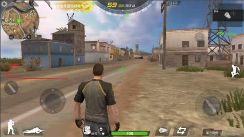 当我们来到十字路口的位置时,我们有两个选择,一是继续向靠近牛角基地的方向搜索,这个方向的建筑里经常能找到带有消音器的M4A1,很适合在这样的小镇里作战,不容易暴露自己的位置,而且在图二中红圈位置,也就是在椰城与牛角基地的中间地带经常能刷出红色别克轿车,但那里地势十分开阔,很容易被牛角基地里出来的敌人居高临下的射击,所以为了稳妥起见,我建议各位小伙伴仍然按图2中红色箭头方向向右行进,同样,我们最好不要在公路上行走,最好绕道建筑的后面逐个对建筑搜索。