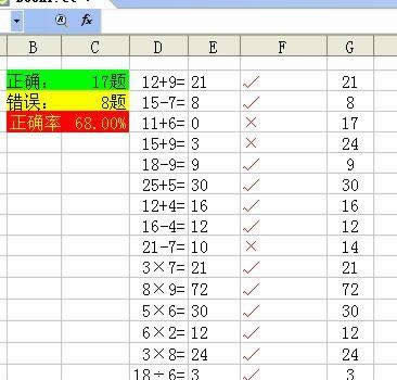 阅读全文今天笔者想到了一个关于速算的教程,我将利用WPS表格帮老师测试小学生速算能力。效果图① 将事先准备好的题目列在表格中D列中,将答案列在G列中,② 根据该图在F6中输入公式:“=IF(E2=G2,&q