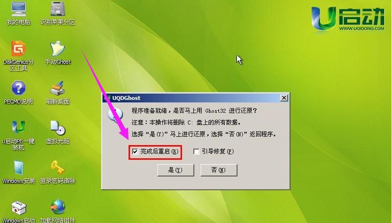 当点击确定按钮后,会弹出一个提示窗口。该窗口提示我们是否进行还原,我们只需点击“是(Y)”按钮即可