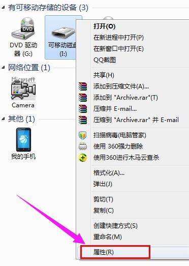 导致U盘打不开的最直接的原因是文件系统损坏。对此常用的方法是对磁盘进行修复。右击“可移动磁盘”,从弹出的右键菜单中选择“属性”。