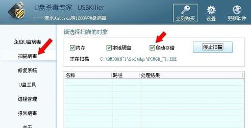 点击“扫描病毒”,勾选内存和移动磁盘→开始扫描。