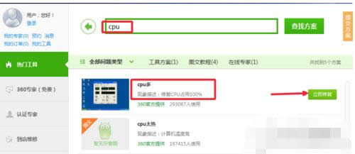 2,然后输入CPU搜索,找到CPU占用多,点击修复。