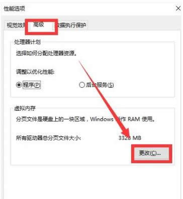 在性能选项设置面板中点击高级,再点击其中的更改按钮。