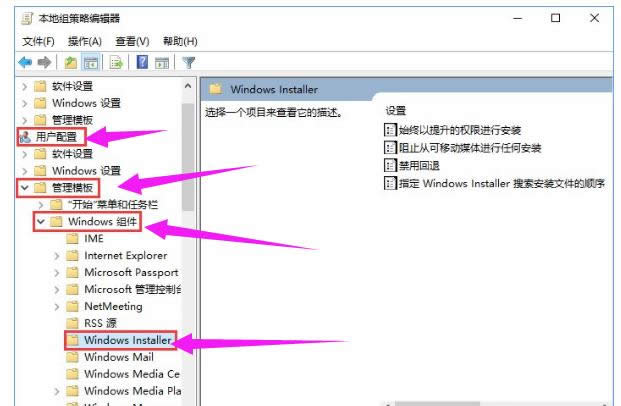 在本地组策略编辑器左侧依次展开“用户配置”—“管理模板“—”Windows组件“—”Windows Installe“