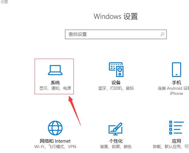 2、进入设置页面,选择 系统(显示、通知、电源)