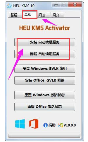如果想免去180天执行一次激活的操作,可以点击【高级】里面的按钮“安装自动续期服务”,如果卸载点击“卸载自动续期服务”即可。