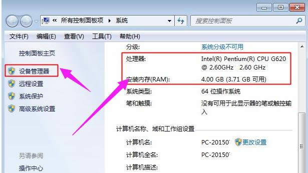 在系统属性可以查看“处理器”和“安装内存”两个信息,以及安装系统的版本和位数,如果要看显卡,则点击左上角“设备管理器”
