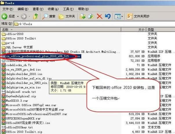 从互联网上下载回来的office 2010安装包,这是一个压缩文件包,它可以自解压安装的。