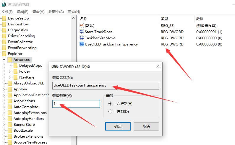 打开UseOLEDTaskbarTransparency,把数值数据改变为“1”,点击“确定”