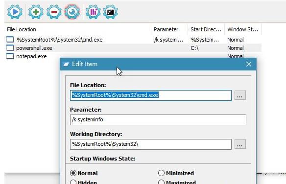 PowerRun工具对应于Windows操作系统有32位和64位两种版本,根据自己所用的Windows版本下载对应的版本运行。PowerRun默认已经添加了命令提示符、Windows PowerShell、记事本等三个程序。可选中其中之一之后,再点击工具栏上的扳手按钮,对参数项目进行编辑(图8)。