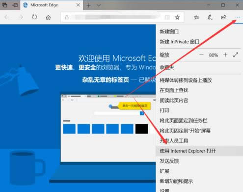 2.打开Microsoft Edge浏览器后,鼠标点击界面右上角的【...】图标,然后在出现的下拉菜单中点击【使用Internet Explorer打开】就可以打开并使用ie浏览器了。