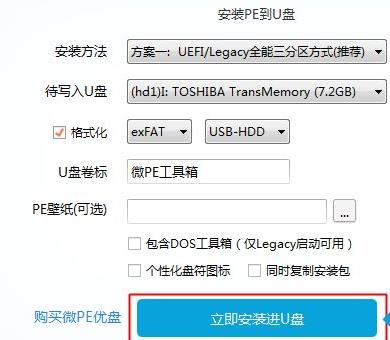 4、插入U盘,等待识别,如果没有识别,点击右侧的图标刷新,默认设置都不用改,按图中所示,直接点击【立即安装进U盘】;