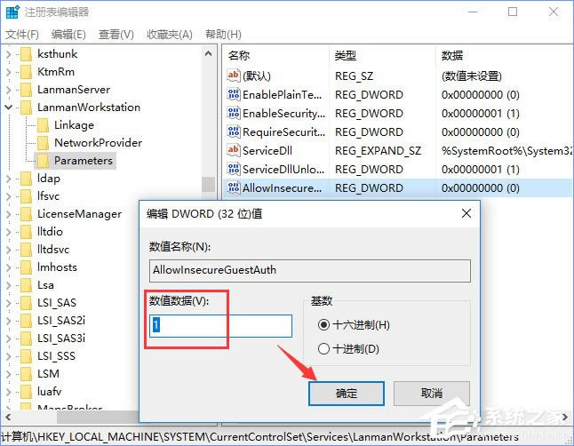 4、然后将新创建的DWORD项重命名为“AllowInsecureGuestAuth”,同时将其值修改为“1”,点击“确定”完成;