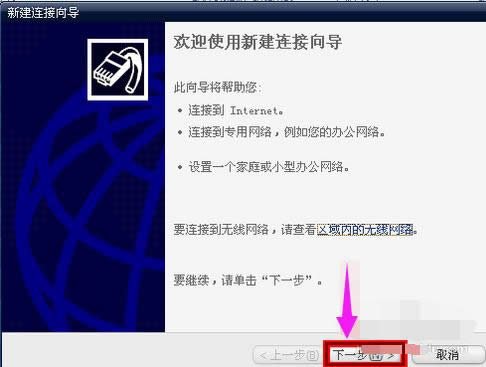 在新建网络连接向导里面,点击:下一步
