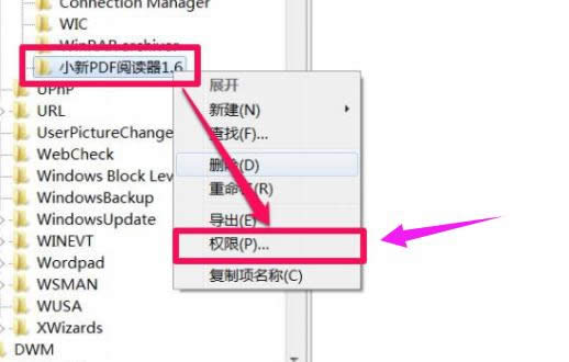如果在注册表中无法删除这个程序,可以在此项上右键,选择“权限”这一项。