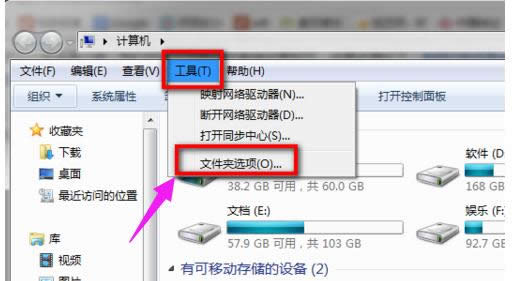 因为需要删除的右键菜单内容在系统盘隐藏文件夹,所以我们需要设置显示隐藏文件夹,接下来我们在上方找到工具——文件夹选项